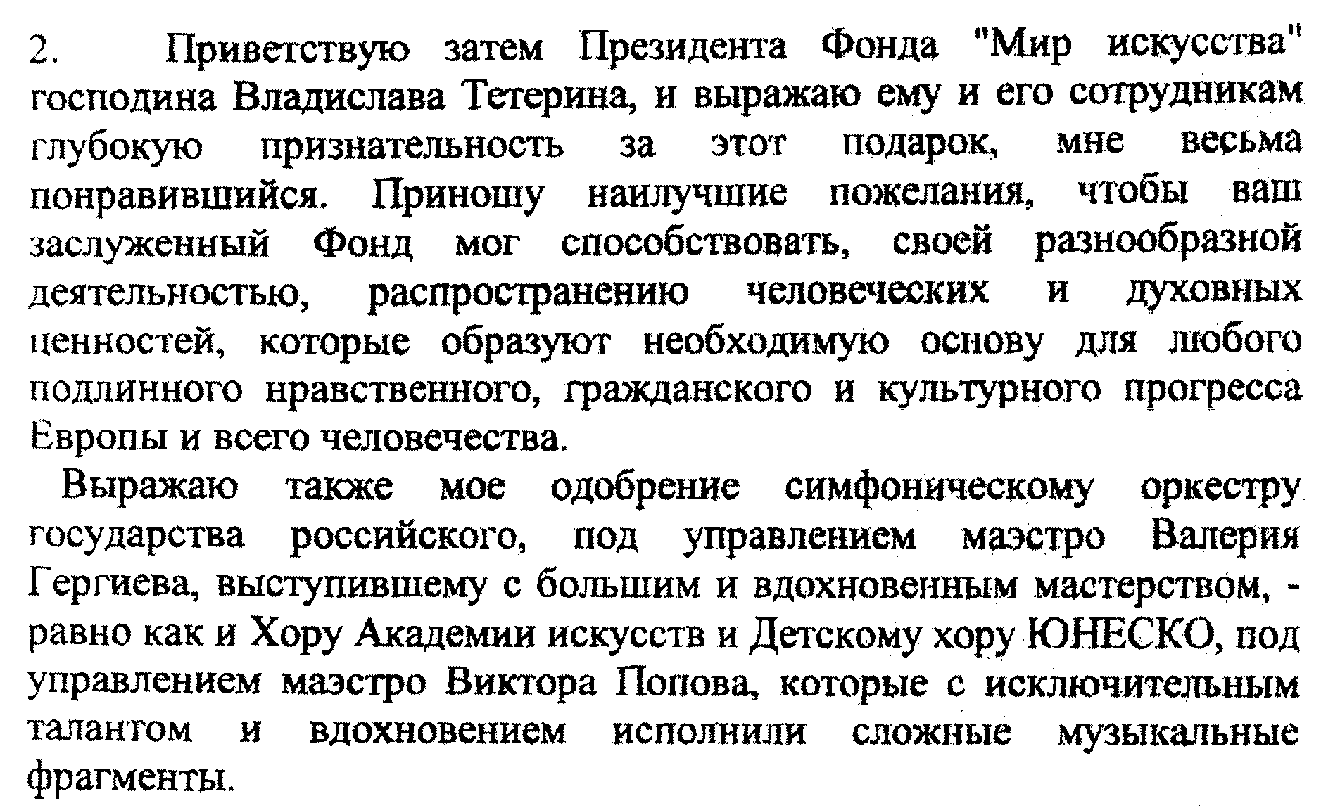 [Saluto poi il presidente della Fondazione "Mondo dell’arte", il signor Vladislav Teterin, ed esprimo a lui ed ai suoi collaboratori profonda riconoscenza per questo dono che ho molto gradito. Formulo i migliori auguri, affinché la vostra benemerita Fondazione possa contribuire, con le sue molteplici attività, a diffondere i valori umani e spirituali che costituiscono la base indispensabile d’ogni autentico progresso morale, civile e culturale dell’Europa e dell’intera umanità.