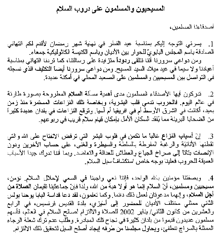 4. Comme croyants au Dieu Unique, nous percevons notre devoir de chercher à instaurer la paix. Chrétiens et musulmans, nous croyons que la paix est avant tout un don de Dieu, c’est pourquoi nos deux communautés respectives prient pour la paix et elles ont toujours appelé à le faire. Comme vous le savez, le Pape Jean-Paul II a invité, le 24 janvier 2002, des représentants de différentes religions à venir à Assise, la cité de saint François, pour prier et s’engager en faveur de la paix dans le monde. Des musulmans nombreux et provenant de plusieurs pays ont contribué à la réussite de cette journée. Il a été demandé de ne pas laisser s’éteindre la flamme de l’espérance, symbolisée par la lampe. Pour sa part, notre Conseil est en train de chercher la meilleure manière de réaliser cette engagement.