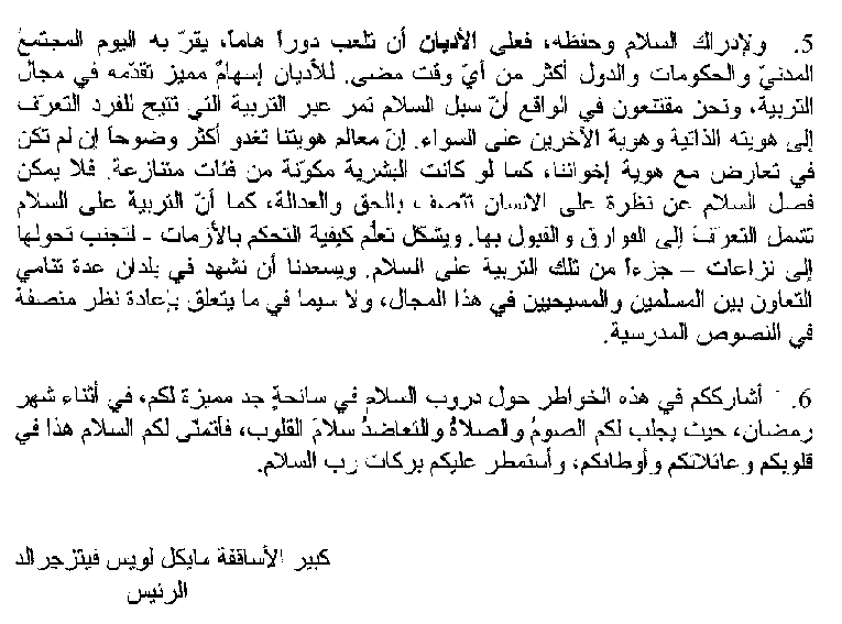 5. Al fine di ottenere la pace e mantenerla, le religioni possono giocare un ruolo importante che, più che mai ai nostri giorni, la società civile e i governi degli Stati riconoscono loro. A questo riguardo, l’educazione è un ambito dove le religioni possono dare un contributo particolare. Siamo infatti convinti che le vie della pace passino per l’educazione. Grazie a quest’ultima, la persona è in grado di riconoscere la propria identità e quella dell’altro. La nostra identità sarà chiara senza essere messa in opposizione a quella dei nostri fratelli, come se l’umanità potesse essere costituita da partiti antagonisti. La pace è infatti inseparabile dal riguardo per l’uomo, nella verità e nella giustizia. L’educazione alla pace comporta ugualmente la conoscenza e l’accettazione delle diversità. Imparare a gestire le crisi – per non farle degenerare in conflitti – fa anche parte di questa educazione alla pace. Noi siamo lieti di vedere crescere, in numerosi paesi, la collaborazione fra cristiani e musulmani in questo ambito, soprattutto per quanto riguarda una revisione obiettiva dei testi scolastici.
