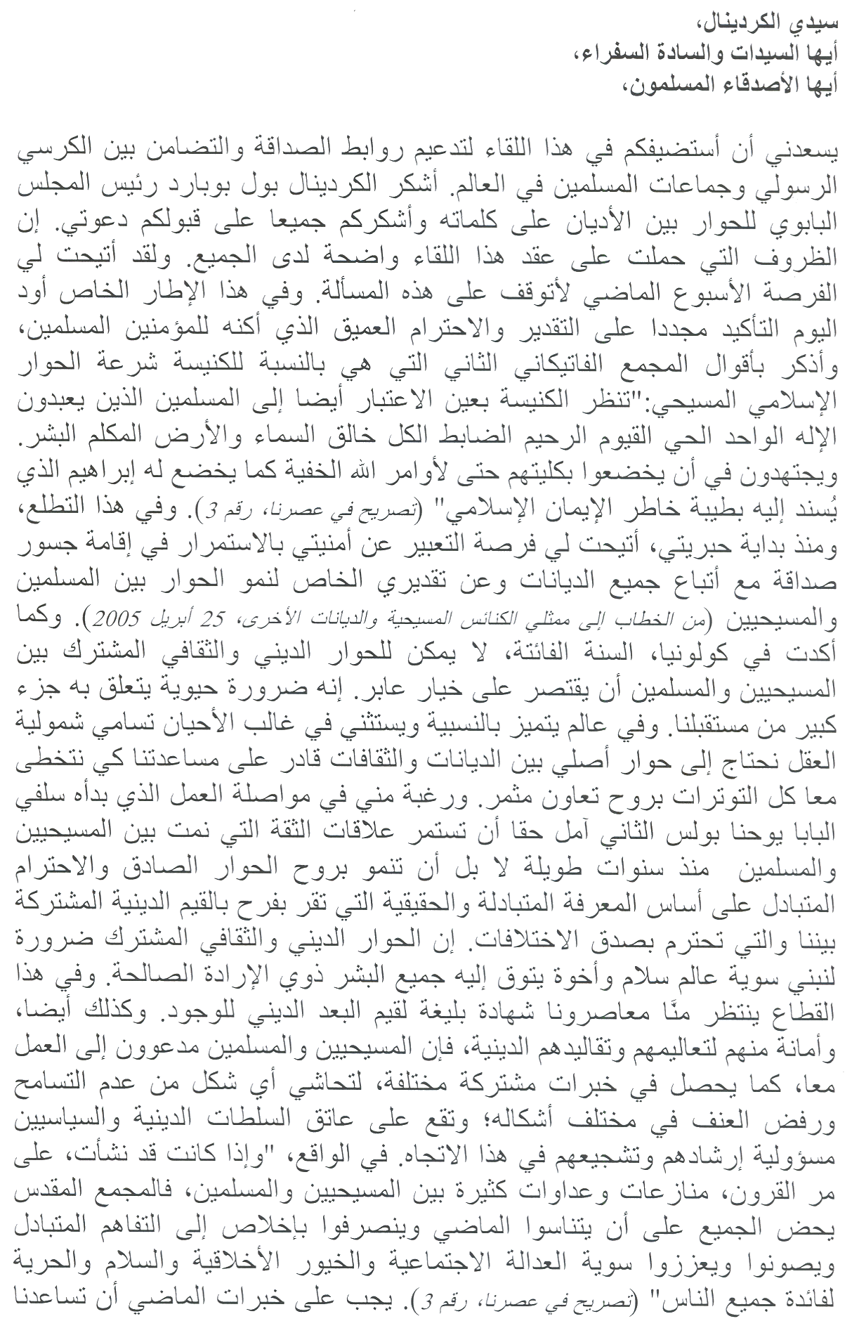Je suis heureux de vous accueillir pour cette rencontre que j’ai souhaitée afin de consolider les liens d’amitié et de solidarité entre le Saint-Siège et les communautés musulmanes du monde. Je remercie Monsieur le Cardinal Paul Poupard, Président du Conseil pontifical pour le Dialogue interreligieux, pour les paroles qu’il vient de m’adresser, ainsi que vous tous qui avez répondu à mon invitation.