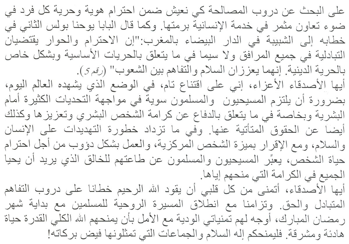 Cari amici, auspico di vero cuore che Dio misericordioso guidi i nostri passi sui sentieri d’una reciproca e sempre più vera comprensione. Nel momento in cui i musulmani iniziano l’itinerario spirituale del mese di Ramadam, rivolgo a tutti i miei cordiali voti augurali, auspicando che l’Onnipotente accordi loro un’esistenza serena e tranquilla. Che il Dio della pace colmi con l’abbondanza delle sue benedizioni voi e le comunità che rappresentate!