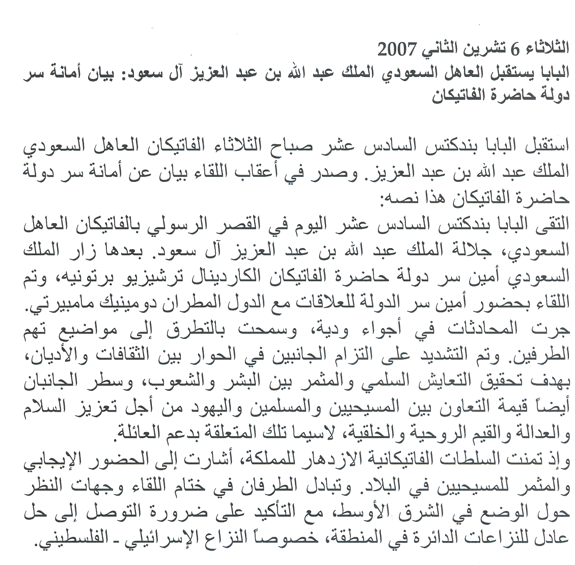 Today in the Apostolic Palace of the Vatican, the Holy Father Benedict XVI met with King Abdallah bin Abdulaziz Al Saud of Saudi Arabia. The sovereign subsequently went on to meet with Cardinal Secretary of State Tarcisio Bertone S.D.B. who was accompanied by Archbishop Dominique Mamberti, secretary for Relations with States.