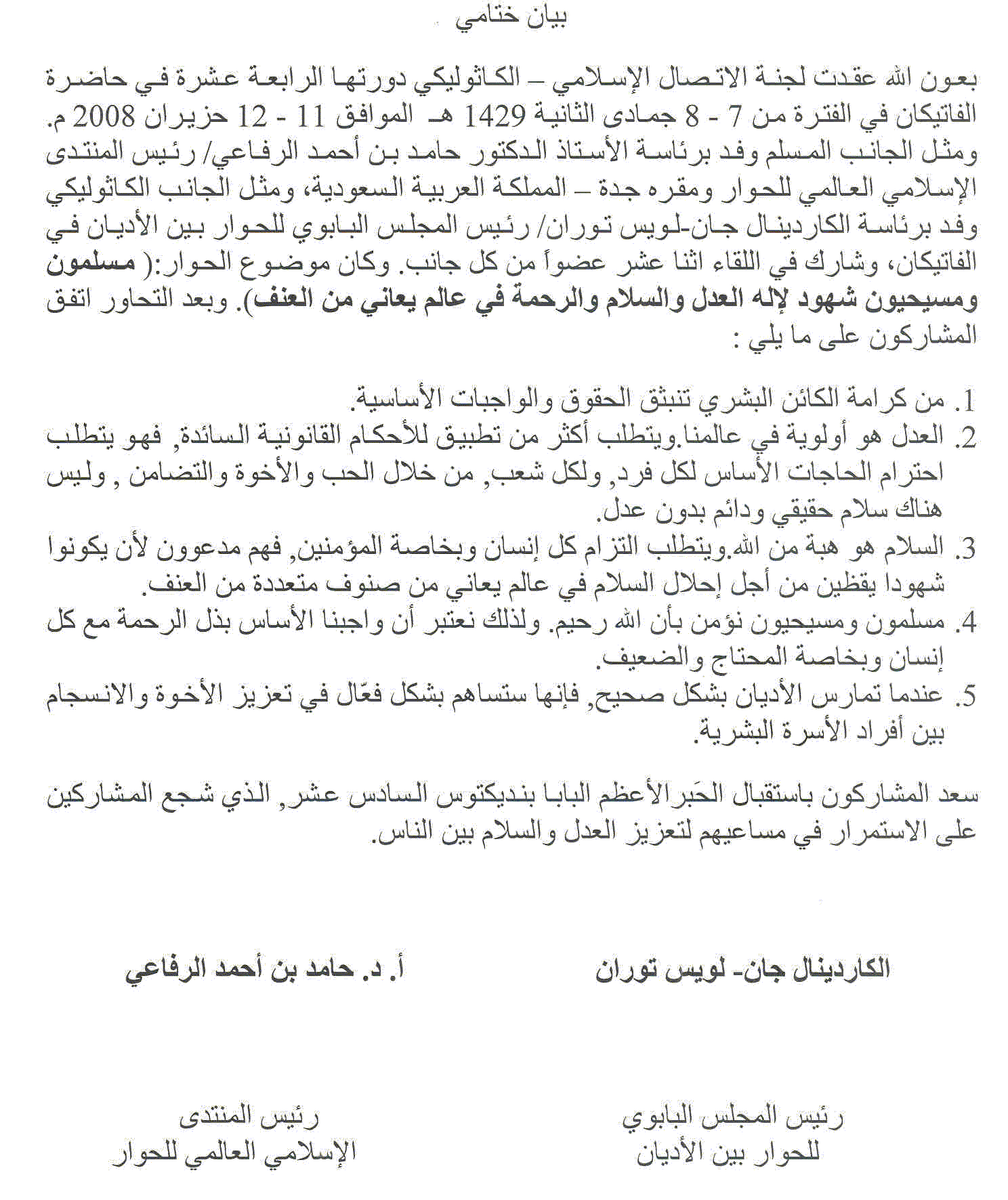 With the help of God, the Islamic-Catholic Liaison Committee held its fourteenth meeting in the Vatican, on 11-13 June 2008, correspondent to 7-9 Jumada the 2nd 1429 H. The Catholic Delegation was headed by H.E. Cardinal Jean-Louis Tauran, President of the Pontifical Council for Interreligious Dialogue, Vatican City, while the Islamic Delegation was headed by H.E. Prof. Dr. Hamid bin Ahmad Al-Rifaie, President of the International Islamic Forum for Dialogue, Jeddah, Saudi Arabia. The theme was "Christians and Muslims as Witnesses of the God of Justice, of Peace and of Compassion in a World Suffering from Violence". The topic was treated from a religious point of view according to the teaching of our two religious traditions. Both sides agreed on the following points:
