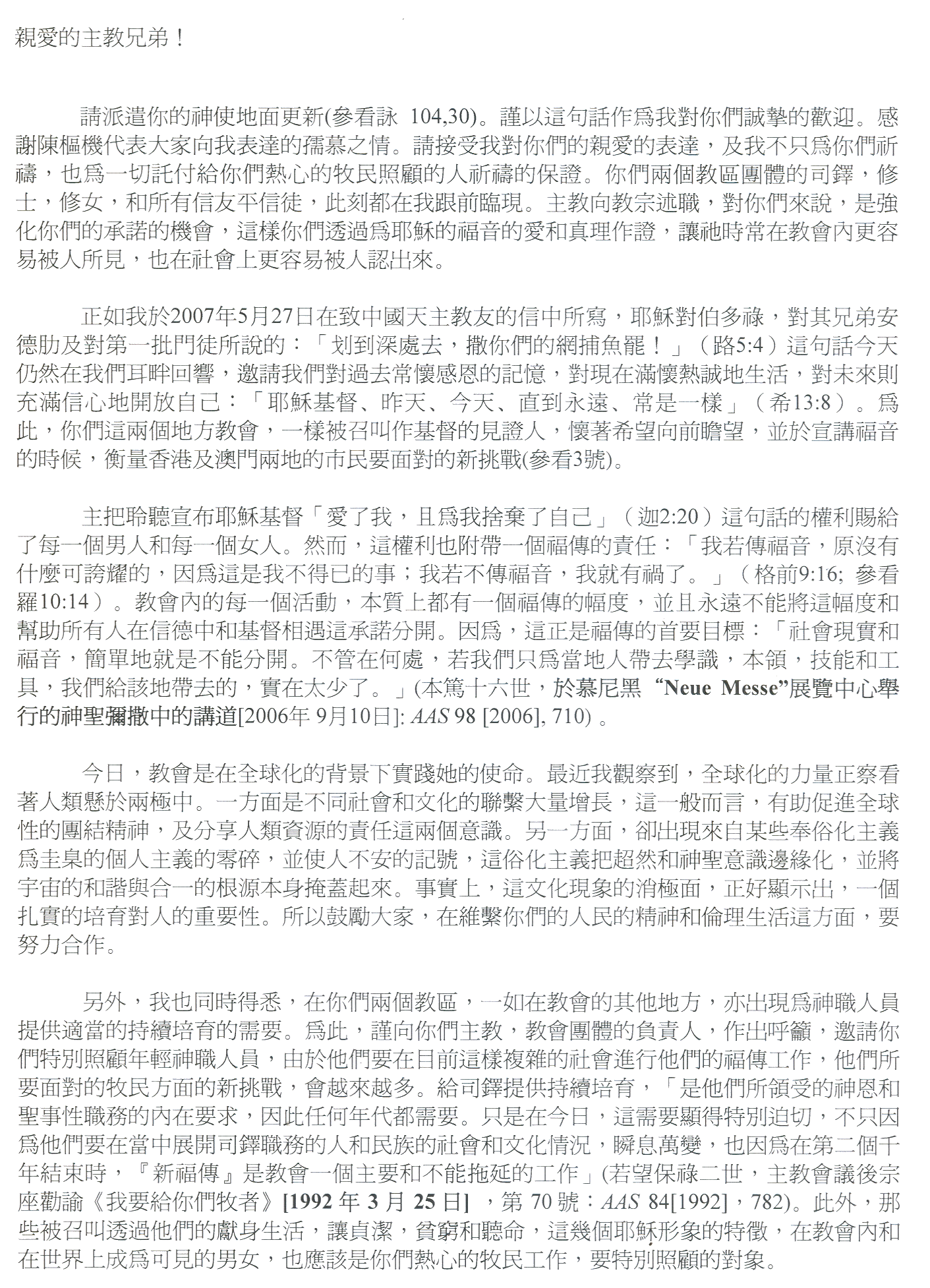 Come ho scritto nella mia Lettera del 27 maggio 2007 alla Chiesa cattolica in Cina, l'invito che Gesù rivolse a Pietro, al fratello Andrea ed ai primi discepoli: «Prendi il largo e calate le reti per la pesca» (Lc 5,4) risuona oggi per noi e ci invita a fare memoria grata del passato, a vivere con passione il presente, ad aprirci con fiducia al futuro: "Gesù Cristo è lo stesso, ieri, oggi e sempre!" (Eb 13,8). Anche le vostre due Chiese particolari sono chiamate ad essere testimoni di Cristo, a guardare in avanti con speranza e a misurarsi — nell'annuncio del Vangelo — con le nuove sfide che le popolazioni di Hong Kong e di Macao devono affrontare (cfr n. 3).