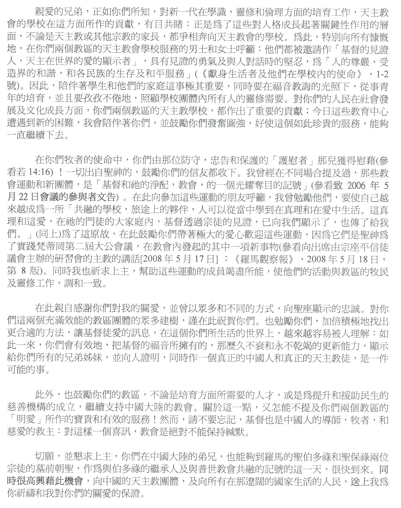 Agradeço-vos pessoalmente a estima e a união que de muitas e diversas formas tendes manifestado à Santa Sé. Alegro-me convosco pelas múltiplas e eficientes realizações das vossas comunidades diocesanas e exorto-vos a um empenho cada vez maior na busca dos meios mais apropriados para tornar a mensagem cristã de amor mais compreensível no mundo onde viveis: deste modo contribuireis efectivamente para demonstrar a todos os vossos irmãos e irmãs a perene juventude e a inexaurível capacidade renovadora do Evangelho de Cristo, testemunhando que se pode ser autênticos chineses e autênticos católicos.