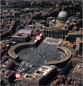 5.1 In occasione degli eventi in Piazza San Pietro, l’area attrezzata per la stampa è la terrazza del Braccio di Carlo Magno (lato sinistro) del Colonnato di Piazza San Pietro, nella parte che affaccia direttamente sul Sagrato (per l’accesso alla terrazza cfr. cartina allegata).