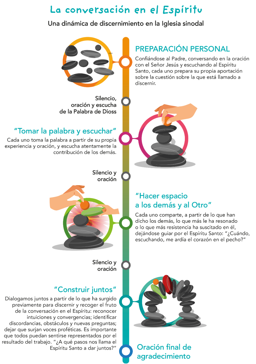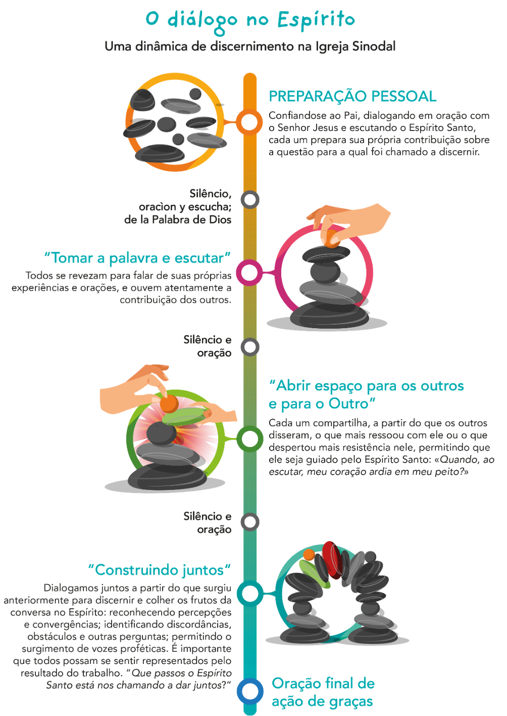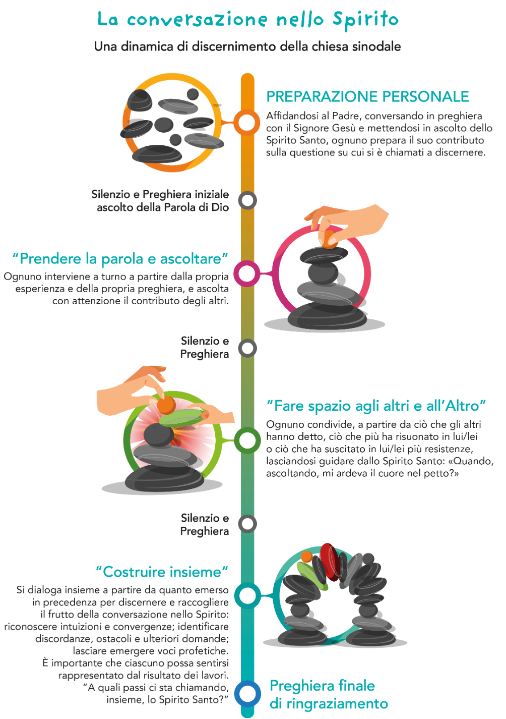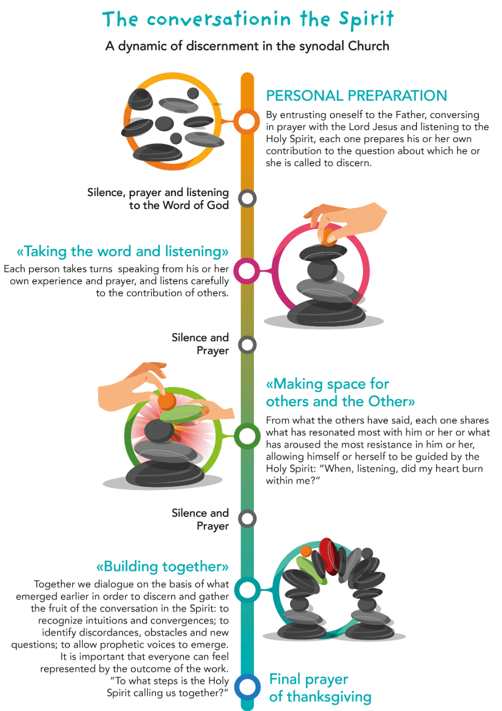 32. Attraversa tutti i continenti il riconoscimento di quanto sia stato fecondo il metodo qui chiamato “conversazione nello Spirito”, adottato durante la prima fase e indicato in alcuni documenti come “conversazione spirituale” o “metodo sinodale” (cfr. figura a p. 16).