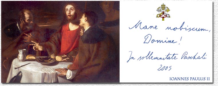 Ed ecco in quello stesso giorno due di loro erano in cammino per un villaggio distante circa sette miglia da Gerusalemme, di nome Emmaus, e conversavano di tutto quello che era accaduto. Mentre discorrevano e discutevano insieme, Gesù in persona si accostò e camminava con loro. Ma i loro occhi erano incapaci di riconoscerlo. Ma essi insistettero: "Resta con noi perché si fa sera e il giorno già volge al declino". Egli entrò per rimanere con loro. Quando fu a tavola con loro, prese il pane, disse la benedizione, lo spezzò e lo diede loro. Allora si aprirono loro gli occhi e lo riconobbero. Ma lui sparì dalla loro vista. Ed essi si dissero l'un l'altro: "Non ci ardeva forse il cuore nel petto mentre conversava con noi lungo il cammino, quando ci spiegava le Scritture?". E partirono senz'indugio e fecero ritorno a Gerusalemme, dove trovarono riuniti gli Undici e gli altri che erano con loro, i quali dicevano: "Davvero il Signore è risorto ed è apparso a Simone". Essi poi riferirono ciò che era accaduto lungo la via e come l'avevano riconosciuto nello spezzare il pane. _______________________________________________________________________________________________ Urbi et Orbi Pasqua 2005 [Francese, Inglese, Italiano, Polacco, Portoghese, Spagnolo, Tedesco] Musica per la Pasqua Galleria Fotografica Settimana Santa 2005 |