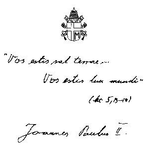 II. The Missal for the Apostolic Journey The liturgical celebrations of the XVII World Youth Day are the highlight and the culmination of the entire event. As is the case for all the Holy Father's travels, the Office of Liturgical Celebrations of the Supreme Pontiff, in cooperation with local liturgical authorities, has prepared a special Missal for this Apostolic Journey. The volume contains texts and rubrics for the three celebrations at which the Pope presides: - the welcoming ceremony; The Papal Welcoming Ceremony - Thursday, July 25, 2002 The theme chosen for the festive welcome of Pope John Paul II to the World Youth Day in Toronto is that of the Beatitudes (Mt 5: 1-12). As the Pope arrives at Exhibition Place on the shores of Lake Ontario, the young people join in welcoming the Successor of Peter, who has been the inspiration and driving force for the World Youth Days ever since the beginning of his pontificate. The ceremony particularly emphasizes the Beatitude: Blessed are the peacemakers, for they will be called children of God (Mt 5: 9). The message of the Beatitudes needs to be heard loud and clear in these times of bloody conflict throughout the world. In the Beatitudes young people can find a blueprint for their Christian life - both as individuals and as members of a community - as well as a source of hope for the future. The ceremony highlights the different nations taking part, each represented by two young people, as a sign that the Gospel represents a leaven of peace and unity among peoples, and that the Cross of Christ has opened a new era of brotherhood. It culminates in the praying of the Our Father, which sets the Pope's visit in the broader spiritual context of World Youth Day, making all people brothers and sisters of Jesus Christ and children of the one Father. The celebration of Vespers - Saturday, July 27, 2002 The Great Prayer Vigil led by Pope John Paul II on Saturday evening, July 27, is clearly inspired by the theme of the World Youth Day: You are the salt of the earth. You are the light of the world (Mt 5:13-14). The assembly prepares for the arrival of the Holy Father by singing Litanies of the Saints and Beati, as a sign of its recognition that those who have gone before us are our elder brethren in the faith whom we are called to imitate. Pride of place is given to nine young men and young women designated by His Holiness as witnesses and models for the young people of the present time: Saint Agnes of Rome, Blessed André of Phú Yên, Blessed Pedro Calungsod, Blessed Josephine Bakhita, Saint Therese of Lisieux, Blessed Pier Giorgio Frassati, Blessed Marcel Callo, Blessed Francisco Castelló Aleu, and Blessed Kateri Tekakwitha, the young Iroquois known as the Lily of the Mohawks. The Great Prayer Vigil has as its backdrop the celebration of Vespers, which features, in addition to several specific adaptations, the presence and the testimony of young people from the various continents. As the daylight fades, we call upon the Light of Christ to shine brightly amid our darkness. The Holy Father introduces the Lucernarium service. Nightfall is an appropriate time to open our hearts to peace, as the deepening shadows invite us to recall the evening sacrifice of Christ, who gave himself up for our salvation. As the candles are lit and their light begins to spread, the assembly acclaims the presence of Christ in a number of different languages: Ukrainian, Mohawk, Korean, Russian, Japanese, Hungarian, Dutch, Slovenian, Romanian and Croatian. Each of the Psalms is preceded by a brief introduction, and each ends with a moment of meditation which includes a witness by young people and a prayer. Psalm 27 is a confession of faith and an acknowledgment of the power of God, our light and our salvation. Psalm 141 invites us to lift up our prayer to the Lord like incense, and to demonstrate our child-like trust in God who is our strength. The Philippians Canticle (2:6-11) reflects the faith and the prayer of the early Church as she contemplates the amazing grandeur of the mysteries of the Incarnation and the Redemption. Christ is indeed our Savior, true God and true man, born of the Virgin Mary. The scriptural reading is taken from the First Letter of John (1:1-7). It proclaims that Jesus is the Word of God, who is the fullness of truth and the complete revelation of the divine mystery. The Magnificat is preceded by an introduction which invites the young people to see in Mary the model of every true disciple of the Lord, called before all else to give thanks to God for his many wonders and for the gift of his covenant. The intercessions, which commend to God's gracious mercy the needs of the Church and the world, are offered in German, Cantonese, Czech, Slovak, Mandarin and Filipino. At the conclusion of Solemn Vespers, twenty-four young people are invited to come forward and stand before the Holy Father. Twelve of them carry lighted torches. Twelve others receive a portion of salt while His Holiness delivers the following exhortation: May this salt remind you that you are called to be, for your lands, your cultures and your local Churches, salt which gives flavor, the wisdom of Christ. The light from the candles of all the young pilgrims is an invitation for them to become, in the words of the Pope at World Youth Day 2000, the light of the world and the morning watchmen of the third millennium. The celebration of the Eucharist - Sunday, July 28, 2002 The morning after - July 28, 2002 - at Downsview Park, the young people are invited to join the Successor of Peter for the celebration of the Eucharistic Sacrifice. Together with the Cardinals, Bishops and priests present, the Pope confirms them in their faith, exhorts them to be the salt of the earth and the light of the world, particularly among their young friends, and reminds them that tomorrow they will be leaders of society and the Church. He joins them in praying that, by their words and deeds, they will bring the 