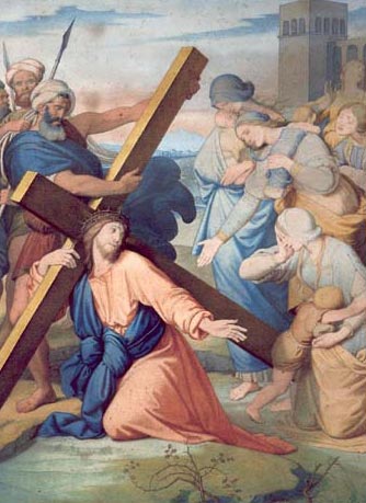 FRIEDRICH OVERBECK (1789-1869) AQUARELL AUF KARTON - VATIKANISCHE MUSEEN NEUNTE STATION Jesus begegnet den Frauen von Jerusalem V/. Adoramus te, Christe, et benedicimus tibi. L. Quia per sanctam crucem tuam redemisti mundum. Aus dem Evangelium nach Lukas. 23, 27-31 Es folgte eine große Menschenmenge, darunter auch Frauen, die um ihn klagten und weinten. Jesus wandte sich zu ihnen und sagte: "Ihr Frauen von Jerusalem, weint nicht über mich; weint über euch und eure Kinder! Denn es kommen Tage, da wird man sagen: Wohl den Frauen, die unfruchtbar sind, die nicht geboren und nicht gestillt haben. Dann wird man zu den Bergen sagen: Fallt auf uns! Und zu den Hügeln: Deckt uns zu! Denn wenn das mit dem grünen Holz geschieht, was wird dann erst mit dem dürren werden?". MEDITATION Der Zug des Verurteilten geht weiter. Begleitet von Soldaten und einer Handvoll weinender Frauen, Frauen, die mit ihm und den Jüngern aus Galiläa in die heilige Stadt hinaufgegangen waren. Sie kennen jenen Menschen. Sie haben sein Wort vom Leben gehört, sie lieben ihn als Meister und Propheten. Hofften sie, daß er Israel befreien würde? (Lk 24, 21). Das wissen wir nicht, aber jetzt beweinen sie jenen Menschen, wie man eine geliebte Person beweint, wie er seinen Freund Lazarus beweint hatte. Er vereinigt sie mit seinem Leiden, ein neues Licht erhellt ihren Schmerz. Die Stimme Jesu spricht von Gericht, ruft aber zur Umkehr; sie verkündet Schmerzen, aber es sind die Geburtswehen einer Gebärenden. Das grüne Holz wird wieder zum Leben kommen, und das dürre Holz wird nicht daran teilhaben. GEBET Jesus, König der Herrlichkeit, das Antlitz mit Blut und Speichel bedeckt, lehre uns, unablässig dein Angesicht zu suchen (Ps 27, 8-9), damit dein Licht unseren Weg erleuchte (Ps 89, 15); lehre uns, es wahrzunehmen unter den Gestalten des von Krankheit gezeichneten, von Entmutigung niedergeschlagenen, von der Ungerechtigkeit gedemütigten Menschen. Laß es geschehen, daß sich unseren Augen die Züge deines geliebten Angesichtes einprägen; die "Geringsten deiner Brüder" (Mt 25, 40) sind deren leuchtender Widerschein, Sakrament deiner Gegenwart mitten unter uns. Jesus, von einem Zug weinender Frauen wirst du zur Schädelhöhe begleitet: sie haben dein lichterfülltes Antlitz, dein Gnadenwort, kennengelernt. L. Dir sei Lob und Ehre in Ewigkeit. Alle: Pater noster, qui es in caelis sanctificetur nomen tuum; adveniat regnum tuum; fiat voluntas tua, sicut in caelo, et in terra. Panem nostrum cotidianum da nobis hodie; et dimitte nobis debita nostra, sicut et nos dimittimus debitoribus nostris; et ne nos inducas in tentationem; sed libera nos a malo. Eia, mater, fons amoris, me sentire vim doloris fac, ut tecum lugeam. |