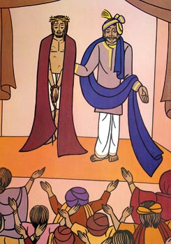 Sœur Marie Claire Naidu - Deuxième moitié du XX siècle Eglise de l'Assomption de la Vierge Marie Bangalore (Inde) SEPTIÈME STATION Jésus, objet de moqueries, est emmené pour être crucifié /V. Adoramus te, Christe, et benedicimus tibi. R/. Quia per sanctam crucem tuam redemisti mundum. De l'Evangile selon saint Matthieu 27, 31 Quand ils se furent bien moqués de lui, ils lui enlevèrent le manteau, lui remirent ses vêtements, et l'emmenèrent pour le crucifier. MÉDITATION Jésus, au nom duquel chacun tombe à genoux aux cieux et sur terre (cf. Ph 2, 10), est l'objet de moqueries. Nous sommes bouleversés en voyant les degrés de brutalité dans lesquels les êtres humains peuvent sombrer. Jésus est humilié de façons nouvelles aujourd'hui aussi: lorsque les réalités les plus sacrées et profondes de la foi sont banalisées, lorsque l'on laisse le sens du sacré s'effriter, et que le sentiment religieux est relégué dans les vestiges désagréables de l'antiquité. Dans la vie publique, tout risque d'être désacralisé: les personnes, les lieux, les promesses, les prières, les pratiques, les paroles, les textes sacrés, les formules religieuses, les symboles, les cérémonies. Notre vie sociale devient toujours plus sécularisée. Le sacré est effacé. La vie religieuse devient timide. Ainsi, nous voyons que les questions les plus importantes se situent parmi les inepties et les banalités glorifiées. Les valeurs et les normes, qui maintenaient ensemble les sociétés et guidaient les personnes vers les idéaux les plus élevés, sont raillées et jetées à la mer. Jésus continue à être ridiculisé! PRIÈRE Nous avons la foi, Seigneur, mais pas assez. Aide notre incrédulité (cf. Mc 9, 24). Fais que nous ne mettions jamais en doute ou que nous ne nous moquions pas avec cynisme des aspects les plus sérieux de la vie. Accorde-nous de ne pas perdre notre chemin dans le désert de l'absence de Dieu. Rends-nous en mesure de te percevoir dans la brise légère, de te voir aux angles des rues, de t'aimer dans l'enfant qui n'est pas encore né. Dieu, fais-nous comprendre que sur le Thabor ou sur le Calvaire, ton Fils est le Seigneur. Avec ses habits resplendissants ou dépouillés de ses vêtements, il est le Sauveur du monde (cf. Jn 4, 42). Rends-nous attentifs à ses présences silencieuses: dans sa "Parole", dans les tabernacles, les sanctuaires, les lieux humbles, les personnes simples, la vie des pauvres, le rire des enfants, les pins qui murmurent, les collines qui ondulent, la plus petite cellule vivante, l'atome le plus petit et les galaxies lointaines. Fais que nous puissions le regarder avec émerveillement tandis qu'il marche sur les eaux du Rhin, du Nil et du Tanganica. Tous: Pater noster, qui es in cælis: sanctificetur nomen tuum; adveniat regnum tuum; fiat voluntas tua, sicut in cælo, et in terra. Panem nostrum cotidianum da nobis hodie; et dimitte nobis debita nostra, sicut et nos dimittimus debitoribus nostris; et ne nos inducas in tentationem; sed libera nos a malo.