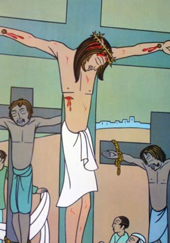 Sœur Marie Claire Naidu - Deuxième moitié du XX siècle Eglise de l'Assomption de la Vierge Marie Bangalore (Inde) ONZIÈME STATION Jésus promet son Royaume au bon larron V/. Adoramus te, Christe, et benedicimus tibi. R/. Quia per sanctam crucem tuam redemisti mundum. De l'Evangile selon saint Luc 23, 39-43 L'un des malfaiteurs suspendus à la croix l'injuriait: "N'es-tu pas le Messie? Sauve-toi toi-même, et nous avec!" Mais l'autre lui fit de vifs reproches: "Tu n'as donc aucune crainte de Dieu! Tu es pourtant un condamné, toi aussi! Et puis, pour nous, c'est juste: après ce que nous avons fait, nous avons ce que nous méritons. Mais lui, il n'a rien fait de mal". Et il disait: "Jésus, souviens-toi de moi quand tu viendras inaugurer ton Règne". Jésus lui répondit: "Amen, je te le déclare: aujourd'hui, avec moi, tu seras dans le Paradis". MÉDITATION Ce n'est pas l'éloquence qui convainc et qui convertit. Dans le cas de Pierre, c'est un regard d'amour; dans le cas du bon larron, c'est la sérénité sans amertume pour la souffrance. La conversion s'accomplit comme un miracle. Dieu, ouvre tes yeux. Tu reconnais sa présence et son action. Tu te rends! Miser sur le Christ est toujours un mystère. Pourquoi fait-on un choix définitif pour le Christ, même avec la perspective des difficultés ou de la mort? Pourquoi les chrétiens fleurissent-ils dans les lieux de persécution? Nous ne le saurons jamais. Mais cela arrive sans cesse. Quand une personne qui a abandonné la foi rencontre le vrai visage du Christ, elle est abasourdie par ce qu'elle voit réellement et comme Thomas, elle pourrait se rendre: "Mon Seigneur et mon Dieu" (Jn 20, 28). C'est un privilège de révéler le visage du Christ aux autres. C'est une joie encore plus grande de le découvrir ou de le redécouvrir. "C'est ta face Seigneur que je cherche, ne me cache pas ta face" (Ps 27, 8). PRIÈRE O Seigneur, aujourd'hui, c'est vers toi que, en larmes, je crie: "Jésus, souviens-toi de moi quand tu viendras inaugurer ton Règne" (Lc 23, 42). C'est vers ce règne que j'aspire avec confiance. C'est la demeure d'éternité que tu as préparée pour tous ceux qui te cherchent avec un cœur sincère. "Ce que personne n'avait vu de ses yeux ni entendu de ses oreilles, ce que le cœur de l'homme n'avait pas imaginé, ce qui avait été préparé pour ceux qui aiment Dieu" (1 Co 2, 9). Aide-moi Seigneur pendant que je marche avec peine vers mon destin éternel. Dissipe l'obscurité sur mon chemin, et tiens mes yeux levés vers le haut! "Conduis-moi, douce lumière, / dans les ténèbres qui m'entourent / Conduis-moi! / La nuit est épaisse / et je suis loin de chez moi. / Conduis-moi! / Dirige mes pas, / Je ne demande pas de voir l'horizon lointain, / un pas après l'autre, voilà qui me suffit" (John Henry Newman, Livre de prières, sous la direction de Vincent Ferrer Blehl, s.j., Birmingham, 1990, p. 32). Tous: Pater noster, qui es in cælis: sanctificetur nomen tuum; adveniat regnum tuum; fiat voluntas tua, sicut in cælo, et in terra. Panem nostrum cotidianum da nobis hodie; et dimitte nobis debita nostra, sicut et nos dimittimus debitoribus nostris; et ne nos inducas in tentationem; sed libera nos a malo.