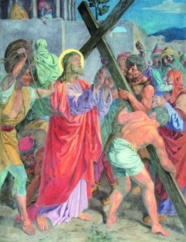 JOSEPH FÜHRICH (1800-1876) VIA CRUCIS 1844-46 EGLISE DE SAINT JEAN NEPOMUCENE - VIENNE DEUXIÈME STATION Jésus est chargé de la Croix /V. Adoramus te, Christe, et benedicimus tibi. /R. Quia per sanctam crucem tuam redemisti mundum. De l'Evangile selon saint Matthieu 27, 27 - 31 De l'Evangile selon saint Jean 19, 17 MÉDITATION Après la condamnation, vient l’humiliation. Ce que les soldats font à Jésus nous semble inhumain. De fait, c’est sans aucun doute inhumain : ce sont des actes de dérision et de mépris à travers lesquels s’exprime une obscure férocité, indifférente à la souffrance, y compris physique, qui est infligée sans motif à une personne déjà condamnée au supplice effrayant de la croix. Cependant, ce comportement des soldats est également, malheureusement, très humain. Mille pages de l’histoire de l’humanité et de la chronique quotidienne confirment que des actions de ce genre ne sont vraiment pas étrangères à l’homme. L’Apôtre Paul a bien mis en lumière ce paradoxe : « Je sais… qu’en moi, … dans l’être de chair que je suis, n’habite pas le bien : … je ne réalise pas le bien que je voudrais, mais je fais le mal que je ne voudrais pas » (Rm 7, 18-19). Il en est véritablement ainsi : dans notre conscience, la lumière du bien est allumée, une lumière qui, dans bien des cas, devient évidente et par laquelle, heureusement, nous nous laissons guider dans nos choix. Mais il arrive souvent le contraire : cette lumière est obscurcie par les ressentiments, par les désirs inavoués, par la perversion du cœur. Et alors, nous devenons cruels, capables des choses les pires, y compris de choses inimaginables. Seigneur Jésus, moi aussi, je suis au nombre de ceux qui se sont moqués de toi et qui t’ont frappé. Tu l’as dit : « Chaque fois que vous l’avez fait à l’un de ces petits qui sont mes frères, c’est à moi que vous l’avez fait » (Mt 25, 40). Seigneur Jésus, pardonne-moi. Tous: Pater noster, qui es in cælis: sanctificetur nomen tuum; adveniat regnum tuum; fiat voluntas tua, sicut in cælo, et in terra. Panem nostrum cotidianum da nobis hodie; et dimitte nobis debita nostra, sicut et nos dimittimus debitoribus nostris; et ne nos inducas in tentationem; sed libera nos a malo.