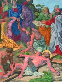 IJOSEPH FÜHRICH (1800-1876) VIA SACRA 1844-46 IGREJA DE SÃO JOÃO NEPOMUCENO - VIENA DÉCIMA PRIMEIRA ESTAÇÃO Jesus é pregado na Cruz V. Adoramus te, Christe, et benedicimus tibi. R. Quia per sanctam crucem tuam redemisti mundum. Do Evangelho segundo Marcos 15, 25-27 Eram nove horas da manhã quando o crucificaram. O letreiro com o motivo da condenação dizia: “O Rei dos Judeus”! Com ele crucificaram dois ladrões, um à direita e outro à esquerda. MEDITAÇÃO Jesus é pregado na cruz. Uma tortura tremenda. E enquanto está suspenso na cruz, muitos são aqueles que o escarnecem e provocam: “A outros salvou... a si mesmo não pode salvar! ... Confiou em Deus; que o livre agora, se é que Deus o ama! Já que ele disse: Eu sou o Filho de Deus” (Mt 27, 42-43). Assim foi escarnecida não somente a sua pessoa, mas também a sua missão de salvação, aquela missão que Jesus estava levando a cumprimento precisamente na cruz. Mas, no seu íntimo, Jesus conhece um sofrimento incomparavelmente maior, que lhe faz irromper num grito: “Meu Deus, meu Deus, por que me abandonastes?” (Mc 15,34). Trata-se, é verdade, das palavras do início de um Salmo, que se conclui com a reafirmação da plena confiança em Deus. E, todavia, são palavras para levar-se totalmente a sério, que exprimem a maior prova a qual Jesus esteve submetido. Quantas vezes, no meio de uma provação, pensamos que fomos esquecidos ou abandonados por Deus. Ou somos tentados a concluir que Deus não existe. O Filho de Deus, que bebeu até ao fundo o seu cálice amargo e, depois, ressuscitou dos mortos, nos diz, ao invés, com todo o seu ser, com a sua vida e a sua morte, que devemos confiar em Deus. Nele podemos crer. Todos: Pater noster, qui es in cælis; sanctificetur nomen tuum; adveniat regnum tuum; fiat voluntas tua, sicut in cælo et in terra. Panem nostrum cotidianum da nobis hodie; et dimitte nobis debita nostra, sicut et nos dimittimus debitoribus nostris; et ne nos inducas in tentationem; sed libera nos a malo. Sancta Mater, istud agas, Crucifixi fige plagas cordi meo valide. © Copyright 2010 - Libreria Editrice Vaticana |