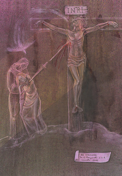 Sr. ELENA MARIA MANGANELLI, O.S.A. VIA CRUCIS LECCETO (SIENNE) 2011 DOUZIÈME STATION Jésus meurt sur la Croix Jésus vit sa mort comme un don d’amour V. Adoramus te, Christe, et benedicimus tibi. R. Quia per sanctam crucem tuam redemisti mundum. De l’Évangile selon saint Jean. 19, 28-30 Après quoi, sachant que désormais tout était achevé pour que l’écriture fût parfaitement accomplie, Jésus dit : « j’ai soif. » un vase était là, rempli de vinaigre. on mit autour d’une branche d’hysope une éponge imbibée de vinaigre et on l’approcha de sa bouche. quand il eut pris le vinaigre, Jésus dit : « c’est achevé » et, inclinant la tête, il remit l’esprit. « J’ai soif ». « C’est accompli ! ». Par ces deux paroles, Jésus nous confie, en jetant un regard vers l’humanité et un autre vers le Père, le désir ardent qui a animé sa personne et sa mission : l’amour pour l’homme et l’obéissance au Père. Un amour horizontal et un amour vertical : voici le dessin de la Croix ! Et du point de rencontre du double amour, là où Jésus incline la tête, jaillit l’Esprit Saint, premier fruit de son retour au Père. Dans ce souffle vital de l’accomplissement résonne le rappel à l’œuvre de la création[44], à présent rachetée, ainsi que le rappel à nous tous qui croyons en lui, à « compléter en notre chair ce qui manque aux épreuves du christ »[45]. jusqu’à ce que tout soit accompli ! Seigneur Jésus, mort pour nous ! Tu demandes pour donner, tu meurs pour délivrer et, en même temps, tu nous fais découvrir dans le don de soi le geste qui crée l’espace de l’unité. Pardonne le vinaigre de notre refus et de notre incrédulité, pardonne la surdité de notre cœur à ton cri de soif qui continue de monter de la souffrance de tant de frères. Viens, Esprit Saint, héritage du fils qui meurt pour nous : sois le guide qui « nous introduit à la vérité tout entière »[46] et la « racine qui nous garde dans l’unité »[47] ! Tous: Pater noster, qui es in cælis: sanctificetur nomen tuum; adveniat regnum tuum; fiat voluntas tua, sicut in cælo, et in terra. Panem nostrum cotidianum da nobis hodie; et dimitte nobis debita nostra, sicut et nos dimittimus debitoribus nostris; et ne nos inducas in tentationem; sed libera nos a malo.