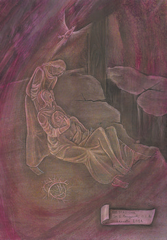TREIZIÈME STATION Le corps de Jésus est accueilli V. Adoramus te, Christe, et benedicimus tibi. De l’Évangile selon saint Jean. 19, 32-35.38 Les soldats vinrent donc et brisèrent les jambes du premier, puis de l’autre qui avait été crucifié avec lui. Venus à Jésus, quand ils virent qu’il était déjà mort, ils ne lui brisèrent pas les jambes, mais l’un des soldats, de sa lance, lui perça le côté et il sortit aussitôt du sang et de l’eau. Celui qui a vu rend témoignage – son témoignage est véritable, et celui-là sait qu’il dit vrai – pour que vous aussi vous croyiez (…) Le côté ouvert de Jésus : la blessure devient une fente, une porte ouverte sur le cœur de Dieu. Ici, son amour infini pour nous se laisse puiser comme une eau qui vivifie et une boisson qui désaltère invisiblement, et fait renaître. Nous aussi, nous nous approchons du corps de Jésus descendu de la Croix et soutenu par les bras de sa mère. « Ce n'est pas, en effet, par la marche que nous nous approchons du Christ: c'est par la foi; pour cela, nous n'avons pas de mouvement à imprimer à notre corps : il suffit d'avoir au cœur de la bonne volonté. »[48] Dans ce corps inanimé, nous nous reconnaissons comme ses membres blessés et souffrants, mais protégés par l’étreinte affectueuse de sa Mère. Seigneur Jésus, Viens, Esprit Saint,