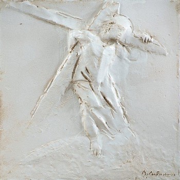 Via Crucis Bas-reliefs (2009) Benedetto Pietrogrande (Milan, 1928 - ) Chapelle du Centre du Mouvement des Focolari Rocca di Papa (Rm) Deuxième station Jésus est chargé de la croix V/. Adoramus te, Christe, et benedicimus tibi. R/. Quia per sanctam crucem tuam redemisti mundum. De l’Évangile selon saint Jean 19, 16-17 Alors [Pilate] leur livra Jésus pour qu’il soit crucifié, et ils se saisirent de lui. Jésus, portant lui-même sa croix sortit en direction du lieu-dit : Le Crâne, ou Calvaire, en hébreu : Golgotha. Pilate livre Jésus aux mains des chefs des prêtres et des gardes. Les soldats placent sur ses épaules un manteau écarlate et sur sa tête une couronne d’épines, ils se moquent de lui dans la nuit, le malmènent et le flagellent. Puis au matin, ils le chargent d’un bois pesant, la croix sur laquelle sont cloués les brigands, pour que tous voient quelle fin ont les malfaiteurs. Un grand nombre des siens s’enfuient. Cette histoire d’il y a 2000 ans, se répète dans l’histoire de l’Église et de l’humanité. Aujourd’hui encore. C’est le Corps du Christ, c’est l’Église qui est frappée et blessée, de nouveau. À te voir ainsi, Jésus, couvert de sang, seul, abandonné, raillé, nous nous demandons : « Mais ces gens que tu avais tant aimés, aidés et éclairés, ces hommes, ces femmes n’est-ce-pas aussi nous, aujourd’hui ? Nous aussi, nous nous sommes cachés de peur d’être impliqués, oubliant d’être Tes disciples ». Mais la chose plus grave, Jésus, est que j’ai contribué, moi aussi, à ta souffrance. Nous aussi époux et nos familles. Nous aussi, nous avons contribué à Te charger d’un poids inhumain. Chaque fois que nous ne nous sommes pas aimés, quand nous nous sommes renvoyés la faute de l’un à l’autre, quand nous ne nous sommes pas pardonnés, quand nous n’avons pas recommencé à nous aimer. Et nous au contraire, nous continuons à écouter notre orgueil, nous voulons toujours avoir raison, nous humilions nos proches, et aussi celui qui a lié sa vie à la nôtre. Nous ne nous rappelons plus que Toi-même, Jésus, Tu nous as dit : « Chaque fois que vous l’avez fait à l’un de ces petits, C’est à moi que vous l’avez fait ». Tu as dit cela : « À moi ». Tous : Pater noster, qui es in cælis: sanctificetur nomen tuum; adveniat regnum tuum; fiat voluntas tua, sicut in cælo, et in terra. Panem nostrum cotidianum da nobis hodie; et dimitte nobis debita nostra, sicut et nos dimittimus debitoribus nostris; et ne nos inducas in tentationem; sed libera nos a malo. Amen. Cuius animam gementem, contristatam et dolentem pertransivit gladius. © Copyright 2012 - Libreria Editrice Vaticana |