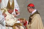 Modifications au rite approuvées par Benoît XVI, Un consistoire entre tradition et innovation, Mgr Guido Marini (L'Osservatore Romano, 17 février 2012) Les Cardinaux de la Sainte Église Romaine [Extrait du Code de Droit canonique, 1983] Can. 349 - Les Cardinaux de la Sainte Église Romaine constituent un Collège particulier auquel il revient de pourvoir à l'élection du Pontife Romain selon le droit particulier; les Cardinaux assistent également le Pontife Romain en agissant collégialement quand ils sont convoqués en corps pour traiter de questions de grande importance, ou individuellement, à savoir par les divers offices qu'ils remplissent en apportant leur concours au Pontife Romain surtout dans le soin quotidien de l'Église tout entière. Can. 350 - § 1. Le Collège des Cardinaux est réparti en trois ordres : l'ordre épiscopal à qui appartiennent les Cardinaux auxquels le Pontife Romain attribue le titre d'une Église suburbicaire, ainsi que les Patriarches Orientaux qui ont été reçus au sein du Collège des Cardinaux; l'ordre presbytéral et l'ordre diaconal. § 2. A chaque cardinal de l'ordre presbytéral et diaconal, le Pontife Romain attribue un titre ou une diaconie à Rome. § 3. Les Patriarches Orientaux qui sont reçus au sein du Collège des Cardinaux ont pour titre leur siège patriarcal. § 4. Le Cardinal Doyen a pour titre le diocèse d'Ostie conjointement avec l'Église qu'il avait déjà en titre. § 5. Par option faite en Consistoire et approuvée par le Pontife Suprême, et en respectant la priorité d'ordre et de promotion, les Cardinaux de l'ordre presbytéral peuvent passer à un autre titre, et les Cardinaux de l'ordre diaconal à une autre diaconie, et si ceux-ci sont restés une décennie entière dans l'ordre diaconal, ils peuvent aussi passer à l'ordre presbytéral. § 6. Le Cardinal de l'ordre diaconal qui passe par option à l'ordre presbytéral prend place avant tous les Cardinaux prêtres qui ont été élevés après lui au Cardinalat. Can. 351 - § 1. Pour la promotion au Cardinalat, le Pontife Romain choisit librement des hommes qui sont constitués au moins dans l'ordre du presbytérat, remarquables par leur doctrine, leurs moeurs, leur piété et leur prudence dans la conduite des affaires; ceux qui ne sont pas encore Évêques doivent recevoir la consécration épiscopale. § 2. Les Cardinaux sont créés par décret du Pontife Romain de fait publié devant le Collège des Cardinaux; à partir de cette publication, ils sont tenus aux devoirs et jouissent des droits définis par la loi. § 3. Celui qui est promu à la dignité cardinalice et dont le Pontife Romain a annoncé la création mais en réservant le nom in pectore n'est tenu pendant cette période à aucun des devoirs des Cardinaux et il ne jouit d'aucun de leurs droits; cependant, une fois son nom publié par le Pontife Romain, il est tenu à ces mêmes devoirs et jouit de ces mêmes droits; mais il obtient la préséance à partir du jour de la réservation in pectore. Can. 352 - § 1. Le Doyen préside le Collège des Cardinaux; quand il est empêché, il est remplacé par le Vice-Doyen; le Doyen ou le Vice-Doyen ne possède aucun pouvoir de gouvernement sur les autres Cardinaux, mais il est considéré comme le premier parmi ses pairs. § 2. Quand la fonction de Doyen devient vacante, les Cardinaux titulaires d'une Église suburbicaire et eux seuls, sous la présidence du Vice-Doyen, s'il est là, ou du plus ancien d'entre eux, élisent du sein de leur groupe celui qui sera le Doyen du Collège; ils communiquent son nom au Pontife Romain à qui il revient d'approuver l'élu. § 3. De la même façon qu'au § 2, sous la présidence du Doyen lui-même, est élu le Vice-Doyen ; il revient également au Pontife Romain d'approuver l'élection du Vice-Doyen. § 4. Si le Doyen et le Vice-Doyen n'ont pas de domicile à Rome, ils doivent en acquérir un. Can. 353 - § 1. Les Cardinaux apportent leur aide au Pasteur Suprême de l'Église par une action collégiale surtout dans les Consistoires où ils sont réunis sur l'ordre et sous la présidence du Pontife Romain; les Consistoires sont ordinaires ou extraordinaires. § 2. Au Consistoire ordinaire sont convoqués tous les Cardinaux, du moins ceux qui se trouvent à Rome, afin d'être consultés sur certaines affaires graves, mais qui surviennent assez communément, ou bien afin d'accomplir certains actes particulièrement solennels. § 3. Au Consistoire extraordinaire qui est célébré lorsque des nécessités particulières de l'Église ou l'étude d'affaires de grande importance le conseillent, tous les Cardinaux sont convoqués. § 4. Seul le Consistoire ordinaire où sont célébrées certaines solennités peut être public, c'est-à-dire quand, en plus des Cardinaux, y sont admis des prélats, les représentants des sociétés civiles ainsi que d'autres invités. Can. 354 - Les Pères Cardinaux préposés aux dicastères et autres institutions permanentes de la Curie Romaine et de la Cité du Vatican, qui ont soixante-quinze ans accomplis, sont priés de présenter la renonciation à leur office au Pontife Romain qui, tout bien pesé, en décidera. Can. 355 - § 1. Il revient au Cardinal Doyen d'ordonner Évêque le Pontife Romain élu, si l'élu a besoin d'être ordonné. Si le Doyen est empêché, ce droit revient au Vice-Doyen, et si celui-ci est empêché, au Cardinal le plus ancien de l'ordre épiscopal. § 2. Le Cardinal Proto-diacre annonce au peuple le nom du nouveau Pontife Suprême élu; de même, c'est lui qui à la place du Pontife Romain impose le pallium aux Métropolitains ou le remet à leurs procureurs. Can. 356 - Les Cardinaux sont tenus par l'obligation de coopérer étroitement avec le Pontife Romain; aussi, les Cardinaux qui exercent tout office que ce soit dans la Curie et qui ne sont pas Évêques diocésains sont-ils tenus par l'obligation de résider à Rome; les Cardinaux qui ont la charge d'un d
