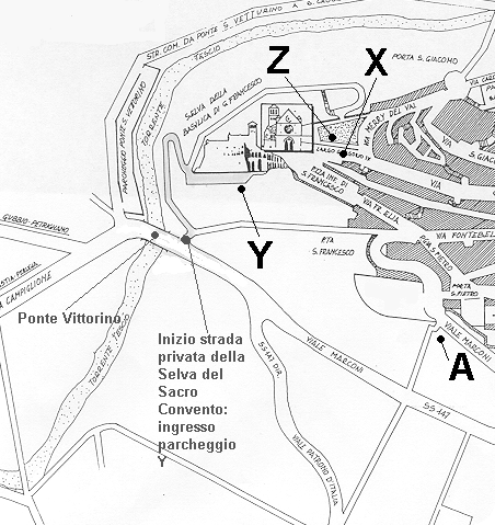 Il Parcheggio Y potrà essere raggiunto, venendo da Perugia, superato Ponte San Vittorino, imboccando sulla destra la stradina privata della Selva del Sacro Convento, seguendo le indicazioni che saranno date dal Servizio dordine. b. Laccesso al Parcheggio Y per i mezzi di produzione o di trasmissione delle testate TV, dovrà essere concordato con il Responsabile del Centro Servizi Audiovisivi di Assisi. Il lasciapassare per il Parcheggio Y potrà essere ritirato, dalle testate televisivi che ne hanno fatto richiesto, presso il Centro Servizi Audiovisivi, nella Sala Norsa di Assisi, a partire di lunedì 21 gennaio 2002 . c. Non sarà rilasciato un lasciapassare per i Parcheggi X e Z (laccesso sarà garantito SENZA LASCIAPASSARE, secondo gli accordi presi con il Responsabile locale per la struttura informativa di Assisi, di concerto con la Sala Stampa della Santa Sede). d. Piantina con lindicazione dei parcheggi Legenda
