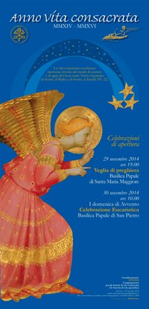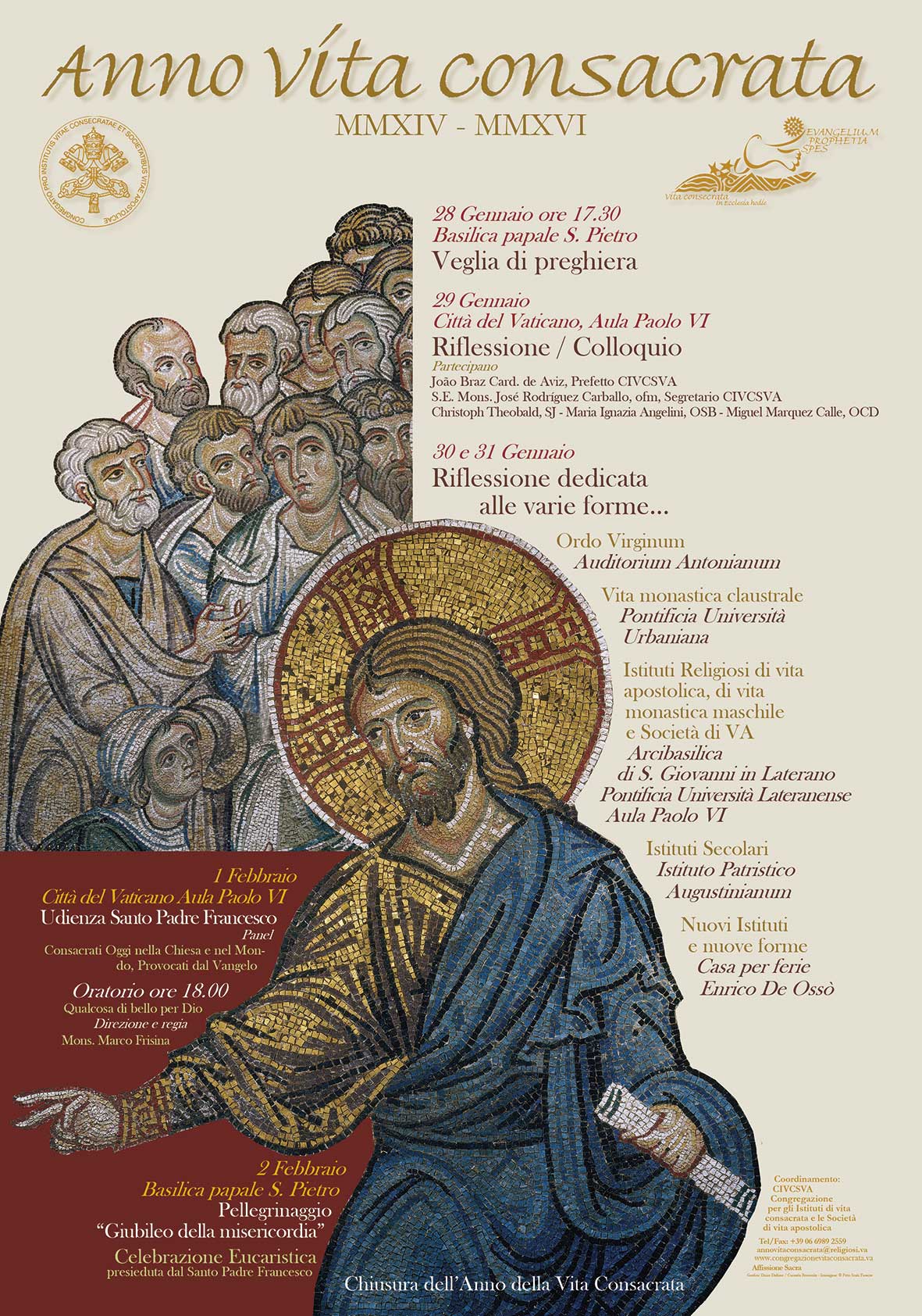 Logo [Francese, Inglese, Italiano, Spagnolo] Calendario [Inglese, Francese, Italiano, Portoghese, Spagnolo, Tedesco] Messaggio del Santo Padre in occasione dell'Apertura dell'Anno della Vita Consacrata (30 novembre 2014) [Francese, Inglese, Italiano, Portoghese, Spagnolo, Tedesco] Ai partecipanti alla Plenaria della Congregazione per gli Istituti di Vita Consacrata e le Società di Vita Apostolica (27 novembre 2014) [Francese, Inglese, Italiano, Portoghese, Spagnolo, Tedesco] Decreto col quale si stabilisce l’opera da compiersi per poter conseguire il dono delle Indulgenze in occasione dell’Anno della Vita Consacrata (23 novembre 2014) [Francese, Inglese, Italiano, Latino, Portoghese, Spagnolo] Lettera Apostolica a tutti i consacrati in occasione dell'Anno della Vita Consacrata (21 novembre 2014) [Francese, Inglese, Italiano, Polacco, Portoghese, Spagnolo, Tedesco] Discorso del Santo Padre Francesco ai partecipanti al Colloquio ecumenico di Religiosi e Religiose, promosso dalla Congregazione per gli Istituti di Vita Consacrata e le Società di Vita Apostolica (24 gennaio 2015) [Francese, Inglese, Italiano, Portoghese, Spagnolo, Tedesco] Santa Messa in occasione della Giornata per la Vita Consacrata (2 febbraio 2015): Omelia del Santo Padre Francesco (Video) [Arabo, Francese, Inglese, Italiano, Polacco, Portoghese, Spagnolo, Tedesco] |