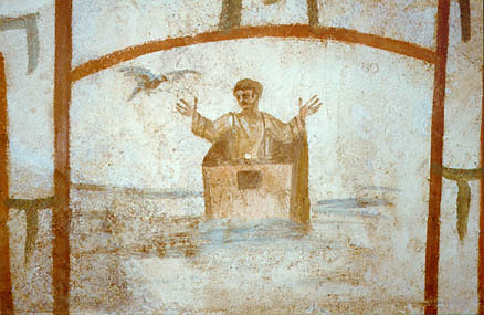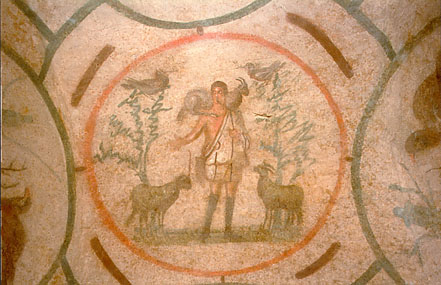 Roma, Catacumbas de Priscila - La Virgen con el Profeta Las catacumbas y la Madre de Dios. En las catacumbas romanas se conserva la imagen más antigua de la Virgen, pintada en el cementerio de Priscilla, en la vía Salaria. El fresco, posiblemente de la primera mitad del siglo III, representa a la Virgen con el Niño en sus rodillas frente a un profeta (quizás Balaam, o Isaías) que indica una estrella, alusión al vaticinio del Mesías. En las catacumbas figuran también otros episodios con la Virgen, como la adoración de los Magos y escenas del pesebre, pero se cree que antes del Concilio de Éfeso todas estas representaciones tenían un significado cristológico y no mariológico. Roma, Catacumbas de Priscila – El Buen Pastor El Buen Pastor en las catacumbas. Una de las imágenes más comunes en el arte de las catacumbas es la del Buen Pastor, y aunque el esquema se haya tomado de la cultura pagana, asume inmediatamente un significado cristológico, inspirándose en la parábola de la oveja perdida. Cristo está representado, por tanto, como un humilde pastor con una oveja sobre los hombros, mientras cuida un pequeño rebaño, a veces constituido sólo por dos ovejas a sus lados. Roma, Catacumbas de S. Sebastián – Grafitos devocionales Los mártires de las catacumbas. En las catacumbas fueron enterrados los mártires de las cruentas persecuciones de los Emperadores Decio, Valeriano y Diocleciano. Junto a las tumbas de los mártires se fue desarrollando muy pronto una forma de culto por parte de los peregrinos, que dejaban grafitos y oraciones grabadas en estos sepulcros excepcionales. Los cristianos trataban de colocar las sepulturas de sus propios difuntos lo más cerca posible de las tumbas de los mártires porque se creía que también en el paraíso se podía establecer esta cercanía mística. Las catacumbas y los Padres de la Iglesia. Entre fines del siglo IV y principios del siglo V, los Padres de la Iglesia describieron las catacumbas. El primero fue S. Jerónimo; cuenta que, cuando era estudiante, iba los domingos a visitar las tumbas de los apóstoles y de los mártires con sus compañeros de estudio: “Entrábamos en las galerías, excavadas en las entrañas de la tierra... Raras luces, procedentes de la superficie, atenuaban un poco las tinieblas... Adelantábamos lentamente, paso a paso, completamente envueltos en la oscuridad”. El poeta ibérico Prudencio recuerda, además, que en los primeros años del siglo V muchos peregrinos llegaban de los alrededores de Roma y también de las regiones limítrofes para venerar la tumba del mártir Hipólito, sepultado en las catacumbas de la vía Tiburtina. Los pontífices restauran las catacumbas. En la segunda mitad del siglo IV, el Papa Dámaso emprendió la tarea de buscar las tumbas de los mártires dispersas en las distintas catacumbas de Roma. Encontró los sepulcros, los hizo restaurar y mandó grabar excelentes elogios en honor de esos primeros modelos de la fe. Durante el siglo VI, los Papas Vigilio y Juan III arreglaron las catacumbas después de las incursiones que habían sido el resultado de la guerra greco-gótica. También más adelante, entre el siglo VIII y el IX, los Pontífices Adriano I y León III restauraron los santuarios de los mártires de las catacumbas romanas. Después de un largo período de olvido, el redescubrimiento, en el siglo XVI, de estos lugares hipogeos, dio valiosos testimonios de la auténtica fe de los primeros cristianos que fueron útiles al movimiento de la Contrarreforma. En fn, en el siglo XIX, el Papa Pío XI creó la Comisión de Arqueología Sacra para conservar dignamente y estudiar los lugares del cristianismo primitivo.