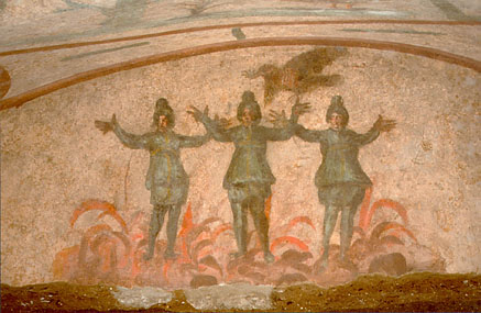 Catacumbas en Italia y en el mundo. La mayor parte de las catacumbas está en Roma; llegan a unas sesenta, y otras tantas se encuentran en la región del Lacio. En Italia, las catacumbas se desarrollan especialmente en el sur, donde la consistencia del terreno es más sólida y, al mismo tiempo, más fácil de excavar. La catacumba situada más hacia el norte está en la isla de Pianosa, mientras los cementerios hipogeos situados más al sur son los de África septentrional, especialmente el de Hadrumetum, en Túnez. Otras catacumbas se encuentran en las regiones de Toscana (Chiusi), Umbría (cerca de Todi), Abruzos (Amiterno, Aquila), Campania (Nápoles), Apulia (Canosa), Basilicata (Venosa), Sicilia (Palermo, Siracusa, Marsala y Agrigento) y Cerdeña (Cágliari, S. Antíoco) Roma, Catacumbas de Priscila – Los tres jovencitos en el horno