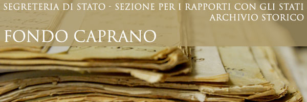 Il Fondo che deriva il proprio nome dal cardinale Pietro Caprano (1759-1834), si compone di 10 pregiati volumi corrispondenti a c.a. 1 metro lineare, rilegati in pelle. I documenti riguardano affari ecclesiastici (benefici, lavori preparatori per i concordati, copie di editti, dispense, elenchi di facoltà e istruzioni) e argomenti oggetto di discussione, in seno a quella specie di “proto-segretariato” che diventò la Sacra Congregazione degli Affari Ecclesiastici Straordinari.