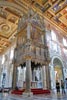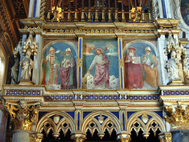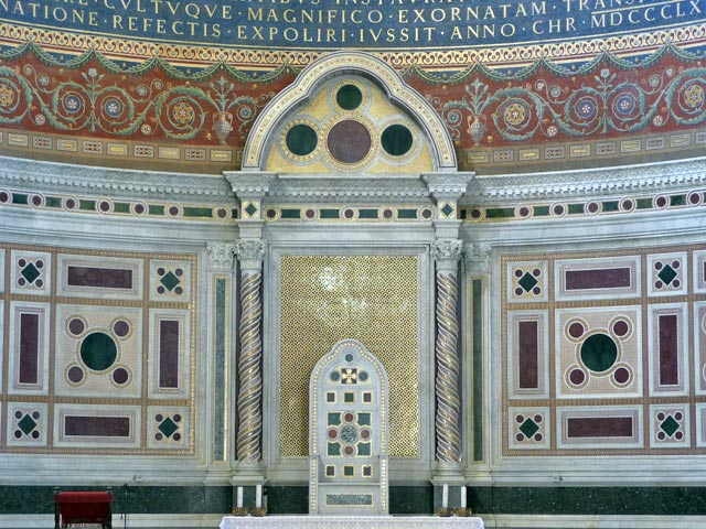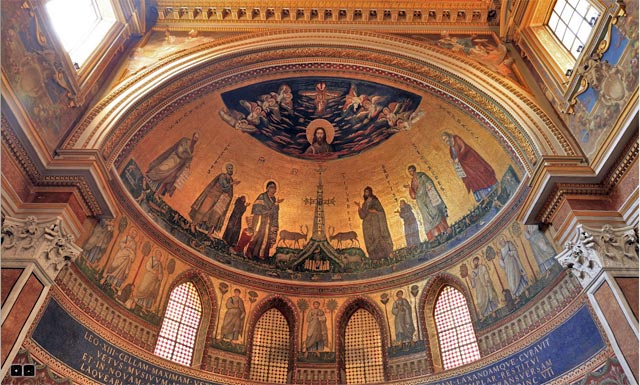 La decorazione dell'abside (camera in latino), rimasta sempre musiva nonostante le vicissitudini e gli interventi subiti, ha in sé l'ermeneutica su quanto mosse l'imperatore Costantino ad innalzare la monumentale Arcibasilica Lateranense. Non è difficile individuare la risoluzione costantiniana nella miracolosa apparizione della Croce, in quel in hoc signo vinces che Costantino portò in battaglia con sopra la Croce. Clemente ХП, infatti, pose il Salvatore con la Croce sul culmine del timpano della facciata orientale. Il Wilpert ritiene che la decorazione musiva dell'abside sia d'epoca costantiniana, forse ideata dallo stesso Costantino per quanto: "la composizione intiera manifesta lo spirito di un dottore ecclesiastico, conoscitore profondo del simbolismo antico. Possiamo ravvisarvi, come si disse, san Silvestro, sotto il cui pontificato avvenne la costruzione della basilica ... siccome la composizione originaria antica venne non poco alterata da Giacomo Torriti, ho creduto di doverla liberare da tutti gli elementi introdotti dall'artista francescano ... a parte l'impronta medievale di tutto il musaico, a parte gli angeli adoranti con il cherubino che ha soppresso la "dextera dei", i soggetti sin qui esaminati furono secondo ogni apparenza fedelmente riprodotti nella ricostruzione del musaico medievale" "Personaggi sacri con rotoli scritti s'affacciano qui per la prima volta nell'arte. Nel vicino Battistero lateranense, una statua argentea di S.Giovanni Battista teneva nella sinistra un volume aperto con la scritta Ecce agnus Dei ecce qui tollit peccata mundi ... siccome le statue furono donate dall'imperatore Costantino, è fuor di dubbio che il rotolo spiegato e scritto nella mano dei santi, sconosciuto all'arte precostantiniana, prese origine dai monumenti della basilica e del Battistero del Laterano". "Come il labaro -osserva ancora il Wilpert- deve la sua forma artistica a Costantino, così è lecito supporre che egli non sia del tutto estraneo anche alla decorazione della basilica, poiché questa era la sua opera favorita che dovette suggellare il trionfo della croce. Una traccia di tale influsso mi sembra scorgere nella rappresentazione più solenne dell'edificio: nel mosaico dell'abside, il quale, levata l'aggiunta non felice di Niccolò IV, è in fondo rimasto quello antico". Il Wilpert, pubblicata una raffigurazione dell'abside senza le figure dei santi Francesco ed Antonio e del pontefice francescano, continua: "qual è il soggetto principale della ricca posizione? Cristo e la Croce, dunque i due elementi dell'apparizione notturna di Costantino, essendo il resto tutto subordinato al soggetto principale. Ecco perché dà nella sua disposizione vagamente l'idea di un labaro gigantesco, con la sola differenza, che nel labaro la Croce è coronata dal nome, qui invece dal busto di Cristo. Tale coincidenza sarà difficilmente l'effetto di un puro caso; atteso il carattere dell'imperatore, noi vi riconosciamo piuttosto la parte, che egli ha voluto che si ripetesse nel punto più cospicuo della sua basilica, come ha voluto essere rappresentato egli stesso con la croce nel luogo più celebre di Roma". "Qui si arresta l'influsso dell'imperatore, in quel tempo non ancora «vescovo negli affari esterni della chiesa», come egli stesso si dichiarò, ma semplice catecumeno, quale rimase fino agli ultimi giorni della sua vita: la morte lo colse con le vesti bianche da neofita, entro l'ottava dopo il battesimo. Il rimanente della composizione rivela lo spirito di un dottore ecclesiastico, conoscitore profondo del simbolismo antico. Avendo poi riguardo al tempo, possiamo ravvisare in quel dottore niente di meno che il grande amico di Costantino, il papa san Silvestro, sotto il cui pontificato avvenne la costruzione della basilica lateranense. Il soggetto principale della composizione sono dunque gli elementi della visione notturna di Costantino, aggiustati naturalmente, in maniera di poter servire all'abside d'una chiesa, nel caso presente della prima cattedrale del cristianesimo: nella visione Cristo appare a Costantino solo, in tutta la persona, s'intende, e con la croce in mano, come lo vediamo tante volte nei monumenti antichi; qui si mostra a tutti i fedeli di Roma, ma solo col busto sporgente da nuvole al di sopra della croce, che ha una forma eminentemente decorativa ed è di materiale preziosissimo". "Fu questa la prima volta, spiega il Wilpert, che un papa sì attentasse a mostrare in un monumento pubblico, accessibile anche ai pagani, il sacro volto del fondatore di quella religione, che ancora ieri era nell'impero proscritta e perseguitata. Lo fece e lo potè fare perché aveva chi gli coprisse le spalle, l'imperatore onnipotente. L'autore del mosaico volle manifestamente esporre una vera effigies domini nostri, la quale del resto è in sostanza quella che esisteva già nell'arte, come risulta da una pittura gnostica e da un'altra del cimitero di Domitilla". Così lo mostra, per citare un altro esempio, la scultura del noto sarcofago "lateranense 174", ritraente una copia del famoso gruppo di Paneade, dal frammento dello scalone di sant'Agnese fuori le Mura e dal sarcofago di Gregorio V delle grotte vaticane. La croce nel mosaico absidale ha il posto principale, secondo un concetto antichissimo già espresso da sant'Ignazio d'Antiochia, il quale, nel lodare gli abitanti di Smirne, esalta il vessillo della croce. Tale composizione si riscontra nel mosaico delle basiliche romane di Santa Pudenziana della fine del secolo IV, nell'arco trionfale di S. Maria Maggiore -in parte copia probabile di quello dell'abside lateransense- realizzato da Jacopo Torriti nel Battistero ortodosso di Ravenna, nell'abside della cappella dei santi Primo e Feliciano in Santo Stefano Rotondo con il busto del Signore del secolo VII, restaurata nel 1990 . Il mosaicista per dare il senso dell'apparizione si affidò all' imago clypeata, cioè all'icona del Cristo, che, decoratala di nimbo -riservato in ori