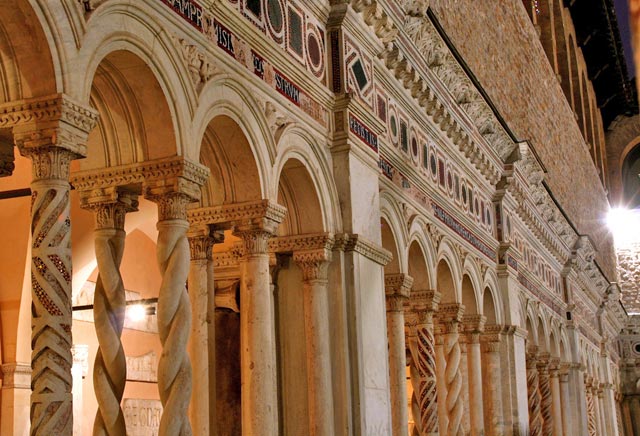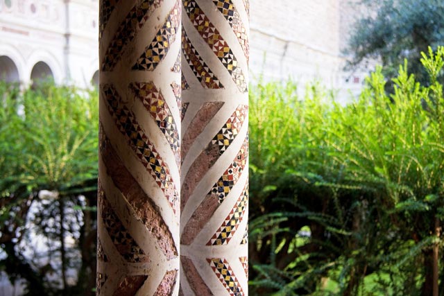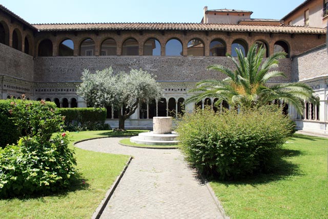 Pietro Vassalletto, della celebre famiglia di marmorari romani, ha iniziato a lavorare alla ricostruzione del chiostro sul finire del pontificato di Innocenzo III, ha proseguito durante quello di Onorio III ed il figlio l'ha condotta a termine durante il pontificato di Gregorio IX (1227-1241), come risulta dall'iscrizione sul fregio del porticato. Il chiostro, quando fu ristrutturato dai Vassalletto adempiva forse da prima del secolo VIII alla funzione storica di tutti i chiostri monastici, quello della raccolta delle acque piovane. Una testimonianza di questa antichità è costituita dalla vera di pozzo detto della Samaritana ivi esistente che lo fa risalire all'epoca carolingia (secolo VIII-IX). Di questa stessa epoca sono i frammenti ricuperati dal rifacimento della pavimentazione ordinata da Martino V e da edifici diruti. Il quadriportico, dal cromatismo musivo arabo-bizantino, ha cinque arconi per lato, la pentafora inclusa in ciascuno di essi apre 125 archetti a tutto sesto sorretti da colonnine binate tortili, a vite, lisce, corse da girari musivi o spezzate da strie ad angolo. Le volte del quadriportico sono sorrette da colonne antiche con capitelli ionici addossate verso l'interno a pilastri, le quali sostengono il loggiato superiore ad arcate. L'elemento architettonico caratterizzante è dato dalle colonnine tortili binate non uniformi, non sempre rivestite di mosaico, a sostegno di esili arcatelle su capitelli diversi, ricchi di motivi intagliati. Le basi sono di tipo attico doppio in due lati, semplici negli altri due lati. Leoni stilofori sono a guardia dei passaggi; nei lati interni la trabeazione è arricchita nella cornice da un fregio a mosaico da teste ferine intagliate sulla grondaia. Un'iscrizione musiva tra motivi di porfidi, serpentini, teste di leoni corre sugli archivolti, collegati da fregi e maschere a rilievo. Tra le opere all’interno del Chiostro possiamo citare la copia della bolla di Gregorio XI (Avignone, 23 gennaio 1372) sul primato dell'Arcibasilica,il monumento sepolcrale di Arnolfo di Cambio destinato al cardinale Riccardo degli Annibaldi,il frammento tombale di Lorenzo Valla (1465), canonico regolare lateranense, celebre umanista; la porta di bronzo, fusa da Uberto e Pietro da Piacenza nel 1196, proveniente da quelle ordinate dal camerlengo Cencio Savelli (Onorio III, 1216-1227) per il Patriarchio Lateranense e da notarsi la cattedra papale di Nicola IV (1290-1292) con la scritta: