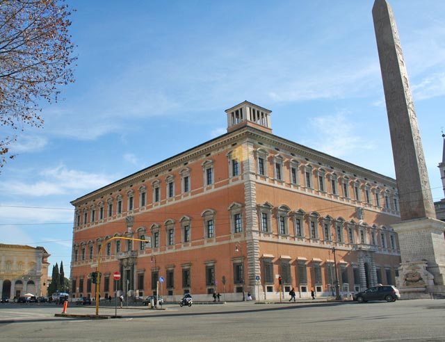 Il Palazzo Apostolico al Laterano, fu residenza ufficiale dei sommi pontefici dalla prima metà del secolo IV fino al trasferimento in Avignone, deciso da Clemente V. La residenza lateranense, al rientro dei papi in Roma avvenuto con Gregorio XI (1371-1378), non era più agibile per cui il pontefice scelse di alloggiare nel Palazzo Apostolico cominciato a costruire sul colle Vaticano da Innocenzo XI (1198-1216) ed ampliato ed abbellito da Niccolò III (1277-1280). Il Patriarchio, contava allora milleduecento anni circa, occupava quasi tutta l'area che dalla Scala Santa va all'Università Lateranense, e dall'Ospedale di S. Giovanni a gran parte della piazza. Gli scavi di Sisto V (1585-1590) per la costruzione del nuovo palazzo cominciarono nel giugno 1585 -il pontefice era stato eletto il 24 aprile 1585- dalla cappella del Ss.mo Crocifisso verso il cortile vecchio fino alle stanze della sala dei Concili ed alla Loggia delle Benedizioni.Dallo scavo vennero fuori colonne, che furono portate a S. Maria Maggiore, monete d'oro con le immagini della Croce e di vari imperatori . Domenico Fontana,che si occupò dei lavori, non si fermò davanti alla veneranda aula dei Concili, fatta affrescare da Bonifacio VIII a Giotto, nella quale si era confrontato il cristianesimo tardoantico e medievale fino al Concilio Lateranense V (1511-1513; 1515-1516). Eppure almeno per la sua grandiosità meritava di essere risparmiata: misurava, secondo lo stesso Fontana, metri 75,35 di lunghezza e metri 20 di larghezza, il tetto era sostenuto da 22 incavallature e da dieci nicchioni cilindrici dal taglio classicistico derivato da quelli del Pantheon ma di proporzioni più slanciate. Sisto V trasferì nel nuovo palazzo il Tribunale della Rota Romana, la Camera Apostolica e diede stanza ai cardinali. Paolo V lo destinò all’arciprete ed ai canonici lateranensi per uso abitazione. Urbano VIII lo convertì in ospedale. Innocenzo XII, dopo un grande restauro, lo donò all’ Ospizio Apostolico di S. Michele, Pio VII nel 1805 lo destinò in parte ad archivio, Gregorio XVI, nel 1838, vi fondò il Museo Gregoriano Lateranense. Giovanni XXIII, il 24 giugno 1962, vi trasferì gli uffici del Vicariato e Giovanni Paolo II vi ha collocato nel 1987 il Museo Storico Vaticano. Il nuovo palazzo, terminato nell'agosto 1589, è articolato su tre piani, ha l'altezza in armonia con quella delle nuove fabbriche a sei piani recentemente sorte nelle vicinanze, si ispira alle architetture di Donato d'Angelo detto Bramante (1444-1514) e di Baldassarre Peruzzi (1481-1536), ha quattro portoni dei quali tre si aprono sulla piazza ed uno introduce in basilica. Il piano generale di decorazione del palazzo sistino fu ideato dal modenese Giovanni Guerra (1540-1618), e coordinato da Gaspare Guerra -fratello di Giovanni- mentre i disegni dei cicli decorativi si debbono a Cesare Nebbia, a Cesare Santarelli, Giovanni Battista Ricci (1550-1623), Baldassarre Croce (1558-1628) ed all'anversano Paolo Brill (1554-1626). Il grande cortile interno quadrato, formato su quello di Palazzo Farnese ascrivibile a Michelangelo, ha pilastri con capitelli dorici e corinzi al pianoterra. Sul fianco basilicale la scala principale larga sette metri, è la più ampia di Roma. Domenico Fontana costruì sulla fiancata settentrionale dell'Arcibasilica, al posto della Loggia delle Benedizioni e delle sale di Costantino e degli Apostoli, un portico con loggiato coperto collegato, secondo un disegno dello stesso Fontana del 1584, con il neo Palazzo Lateranense. Il travertino del nuovo loggiato fu prelevato dal teatro e dalla scala del Belvedere in Vaticano, fatto demolire da Sisto V per costruire l'edificio della Biblioteca Apostolica Vaticana. Sisto V spese per la costruzione del nuovo Palazzo Apostolico 172.884 scudi d'oro. La somma, data la mole dei lavori, risulta abbastanza contenuta a motivo della gratuità dei materiali in gran parte approvvigionati dai monumenti classici e dallo stesso Patriarchio: blocchi di travertino e di peperino provennero dal Settizonio, allora in demolizione.