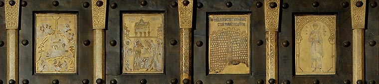 1) La porte byzantine est commandée à Constantinople, en 1070, par le consul amalfitain Pantaléon (en rémission de ses péchés, car ce marchand s’est enrichi en faisant commerce d’esclaves musulmans et chrétiens, trafic interdit par l’Église). L’artiste Théodore représente un cycle christologique, un cycle apostolique (les martyres des apôtres) et un cycle prophétique. Elle est remontée, aujourd’hui, au revers de la Porte Sainte. |