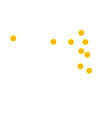 1. Courtyard 2. Central Nave 3. Tomb 4. Apse 5. Transcept1 6. Transcept2 7. Baptistry 8. Cloister 9. Museum