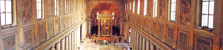 La Basílica de Santa María la Mayor, situada en la cumbre de la colina del Esquilino, es una de las cuatro Basílicas papales de Roma y es la única que ha conservado la antigua estructura paleocristiana. Una tradición muy antigua nos cuenta que fue la Virgen quien inspiró la construcción de la iglesia en el Esquilino, es decir, el lugar en donde Ella quería que se realizara su morada: apareció en un sueño al patricio Juan y al Papa Liberio, pidiéndoles la construcción de la iglesia en su honor, en el lugar que Ella indicaría milagrosamente. La mañana del 5 de Agosto la colina del Esquilino apareció llena de nieve; el Papa definió el perímetro de la nueva iglesia y Juan se ocupó de la financiación. De la iglesia original nos queda tan sólo un paso del Liber Pontificalis en donde se afirma que el Papa Liberio "Fecit basilicam nomini suo iuxta Macellum Liviae". Las recientes excavaciones realizadas debajo de la Basílica actual no nos han revelado nada de la antigua construcción, pese a que se han encontrado importantes piezas arqueológicas como el magnífico calendario del siglo II - III d. C. y los restos de paredes romanas, sólo en partes visibles y que se encuentran en el museo. El campanario de estilo románico renacentista, que mide 75 metros de altura, es el más alto de Roma. Fue construido por Gregorio XI, tras regresar de Aviñón, y cuenta con cinco campanas. Una de ellas es conocida con el nombre de "la perdida" y todos los días a las nueve de la tarde llama a los fieles con un sonido inconfundible. Entrando en el pórtico a mano derecha se halla la estatua de Felipe IV de España, benefactor de la Basílica. El esbozo de la obra es de Juan Lorenzo Bernini y fue realizada por Girolamo Lucenti en el siglo XIII. En el centro se encuentra la gran puerta de bronce realizada por Ludovico Pogliaghi en el año 1949; en ella se distinguen los episodios de la vida de la Virgen, los profetas, los evangelistas y las cuatro mujeres que en el Antiguo Testamento prefiguraron a la Virgen María. A la izquierda está la Puerta Santa, bendecida por Juan Pablo II el día 8 de diciembre en el año 2001, cuya obra de construcción fue llevada a cabo por el escultor Luis Mattei y ofrecida a la Basílica por la Orden Ecuestre del Santo Sepulcro de Jerusalén. En el centro se halla el Cristo resucitado que aparece a la Virgen María representada como la Salus Populi Romani; el modelo para representar a Cristo es el hombre de la Sábana Santa. En lo alto a la izquierda está la Anunciación en el pozo; es un episodio entresacado de los Evangelios apócrifos. En el lado derecho se puede ver una representación de "Pentecostés". Abajo, en la parte izquierda, el Concilio de Éfeso, que definió a María, THEOTOKOS, a la derecha el "Concilio Vaticano II" que la declaró Mater Ecclesiae. El escudo de Juan Pablo II y su máxima están representados en la parte más alta, mientras los dos de abajo pertenecen al Cardenal Furno, que fue arcipreste de la Basílica, y a la Orden del Santo Sepulcro. La actual Basílica pertenece al siglo V d. C. Su construcción está vinculada al Concilio de Éfeso del 431 d. C, que proclamó a María, Theotókos, Madre de Dios, y se llevó a cabo por voluntad de Sixto III, en cuanto obispo de Roma, que la financió. Al entrar en la Basílica se prueba una sensación de grandeza y amplitud: aparece delante de nuestros ojos el resplandor de sus mármoles y la riqueza de las decoraciones; este efecto monumental es debido a la estructura de la Basílica y a la armonía que domina los principales elementos de su arquitectura. Construida según los cánones del "ritmo elegante" de Vitruvio, la Basílica está dividida en tres naves en donde se hallan dos filas de columnas preciosas; a lo largo de ellas corre un artístico entablamento que se interrumpe hacia el ábside debido a dos arcos realizados para la construcción de la Capilla Sixtina y Paolina. Originariamente la parte de la Basílica que se localiza entre el techo y las columnas estaba perforada por grande ventanas, de las cuales se sigue conservando solamente la mitad; en el resto de ellas se han ido construyendo paredes, en donde se pueden admirar una serie de frescos que representan "Historias de la vida de María". Por encima de las ventanas y de los frescos, un friso de madera decorado por preciosas entalladuras que representan una serie de toros cabalgados por amorcillos se une a la cornisa del techo. Los toros representan el símbolo de los Borjas y los escudos de Calixto II y Alejandro VI, los dos papas de la familia de los Borjas, resaltan en el centro del techo. No queda muy claro cuál fue la aportación de Calixto III en la realización de esta obra; sin lugar a duda fue Alejandro VI quien se ocupó de la construcción de la Basílica en la época en que aún desempeñaba su oficio de arcipreste de la misma: el techo fue diseñado por Giuliano de Sangallo y completado por su hermano Antonio. Dice la tradición que fue dorado con el oro de América, regalado por los Reyes Católicos al papa Alejandro VI. A lo largo del suelo de la Basílica se extiende, como si fuera una estupenda alfombra, un mosaico realizado por unos artistas marmolistas ofrecido a Eugenio III en el siglo XII por dos hombres de la nobleza romana, Scoto Paparoni y su hijo Juan. Pero lo que de verdad hace que Santa María la Mayor sea única son los estupendos mosaicos del siglo V, realizados por voluntad de Sixto III y que se desarrollan a lo largo de toda la nave central y sobre el arco de triunfo. Los mosaicos de la nave central resumen cuatro ciclos de la historia Sagrada cuyos personajes son Abrahán, Jacob, Moisés y Josué y en conjunto testimonian la promesa de una tierra que Dios hizo al pueblo judío y su ayuda para llegar a ella. La narración, que no sigue un orden cronológico, comienza en la pared de la izquierda junto el arco triunfal con el sacrificio incruento de Melquisedec, rey-sacerdote. En este recuadro
